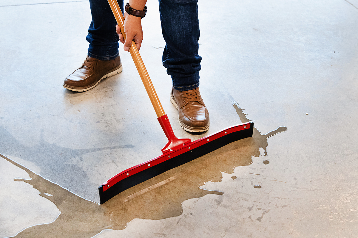 Remove water, chemicals, and mud from a variety of smoother surfaces with the Heavy Duty Curved Floor Squeegee. It is excellent for use on patios, walkways, and industrial sites, as the firm rubber blade is made from real, vulcanized, natural rubber. It's curved design enables the user to easily contain the liquid in front of the squeegee. The steel squeegee backer, as well as the 1.13” thick wood handle, make it the ideal heavy-duty solution to contain and remove liquid cleanups.