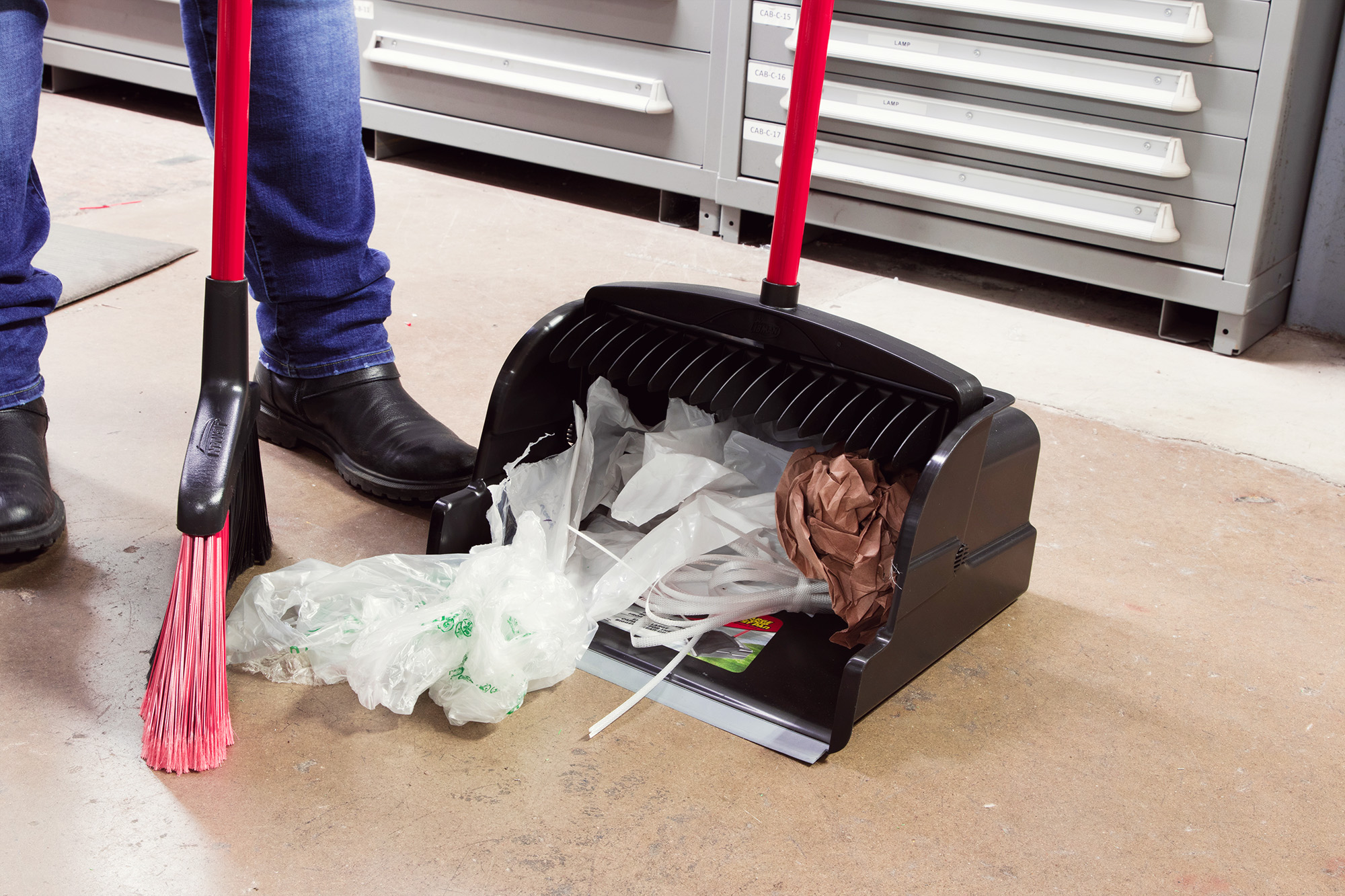 The Large Scoop Dustpan gets the job done on any quick pick-ups of larger debris and garbage. One of the key features is it's ability to lock or unlock the dustpan in place. While unlocked, the pan automatically swivels vertically when it is picked up to hold the debris inside. Built-in "teeth" also clean out any wide-angle broom's bristles directly into the pan. The angled handle grip lightens the load on the wrists while carrying up to 30 lbs of gravel, garbage, debris, and more.