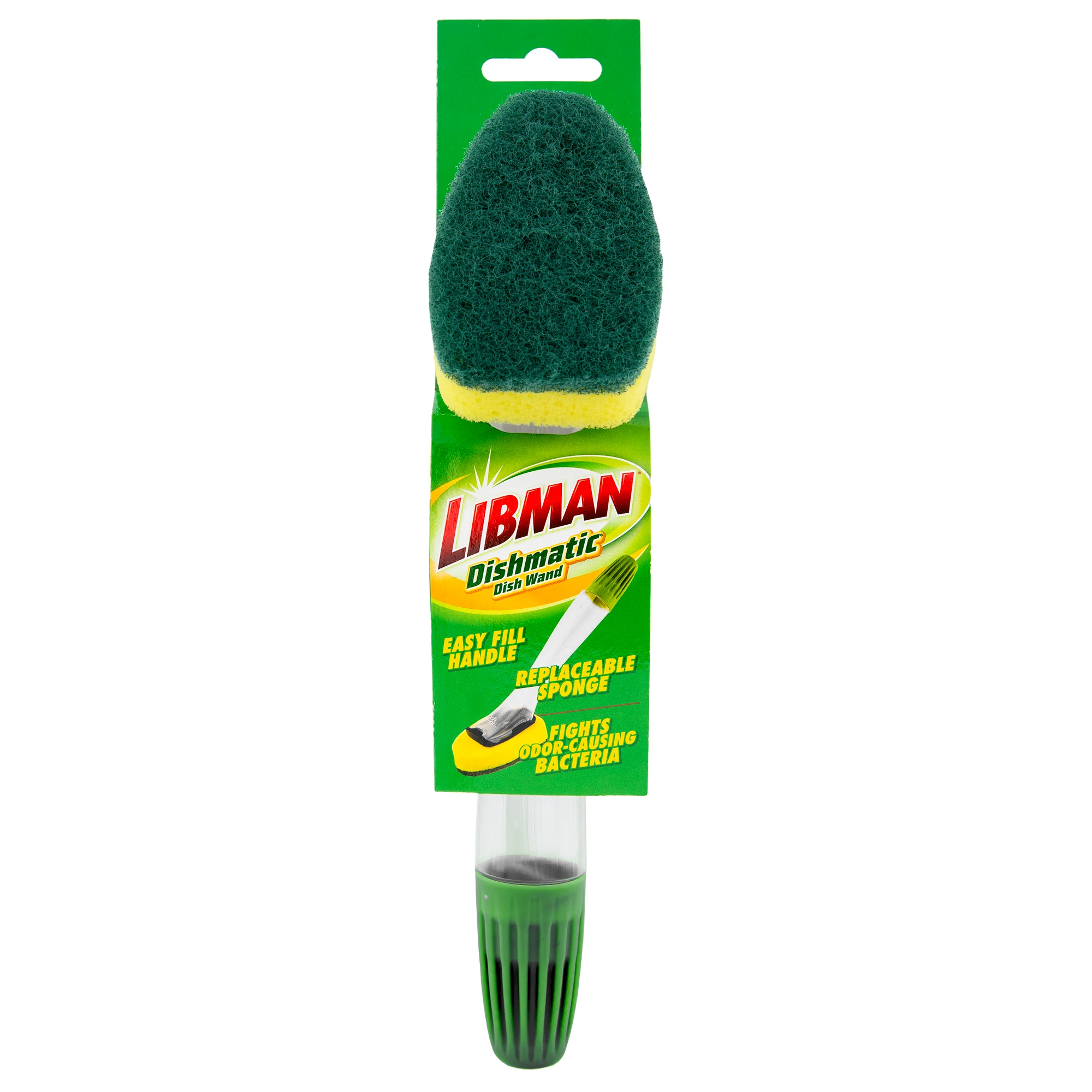 · 10.5” long, sturdy PVC handle holds any dish soap