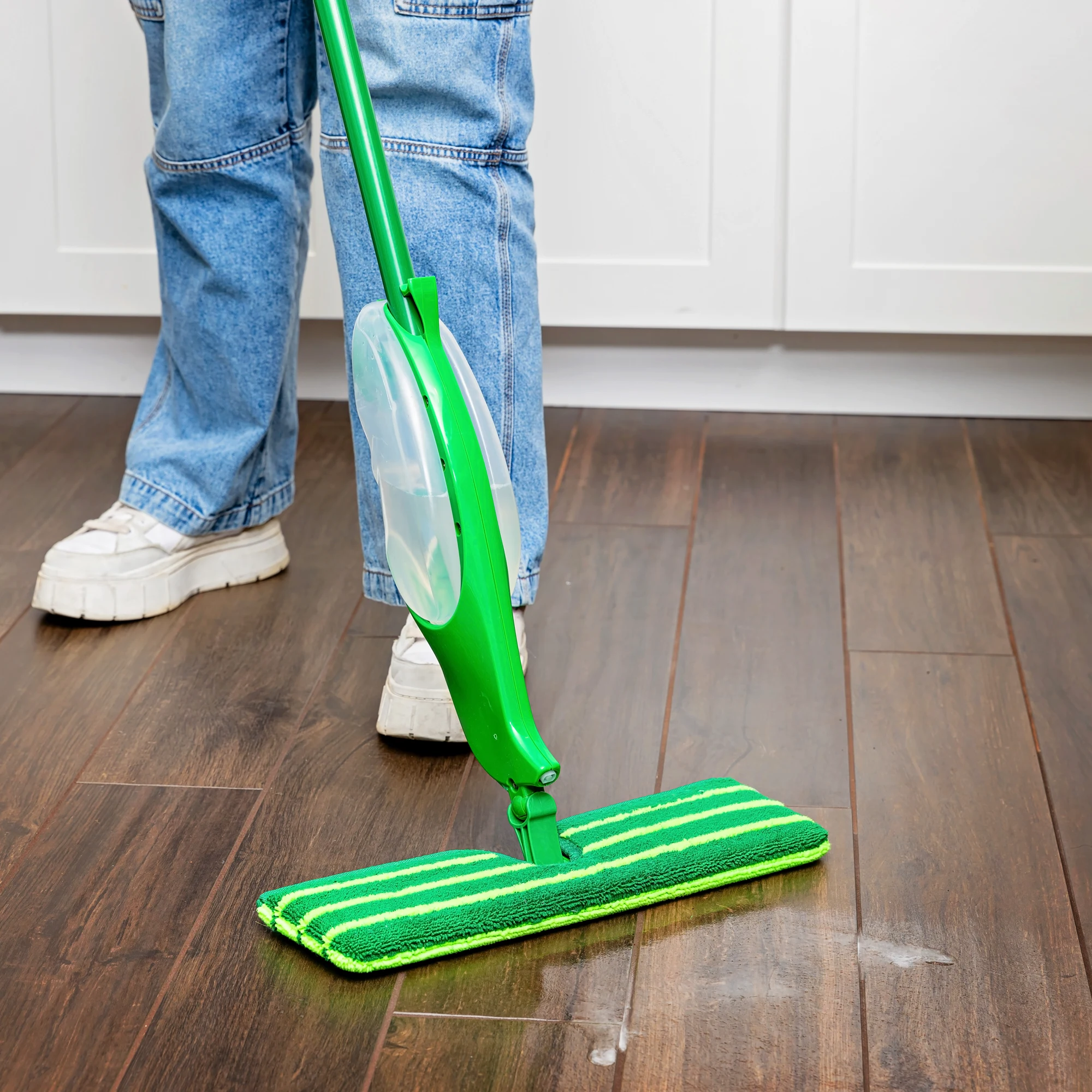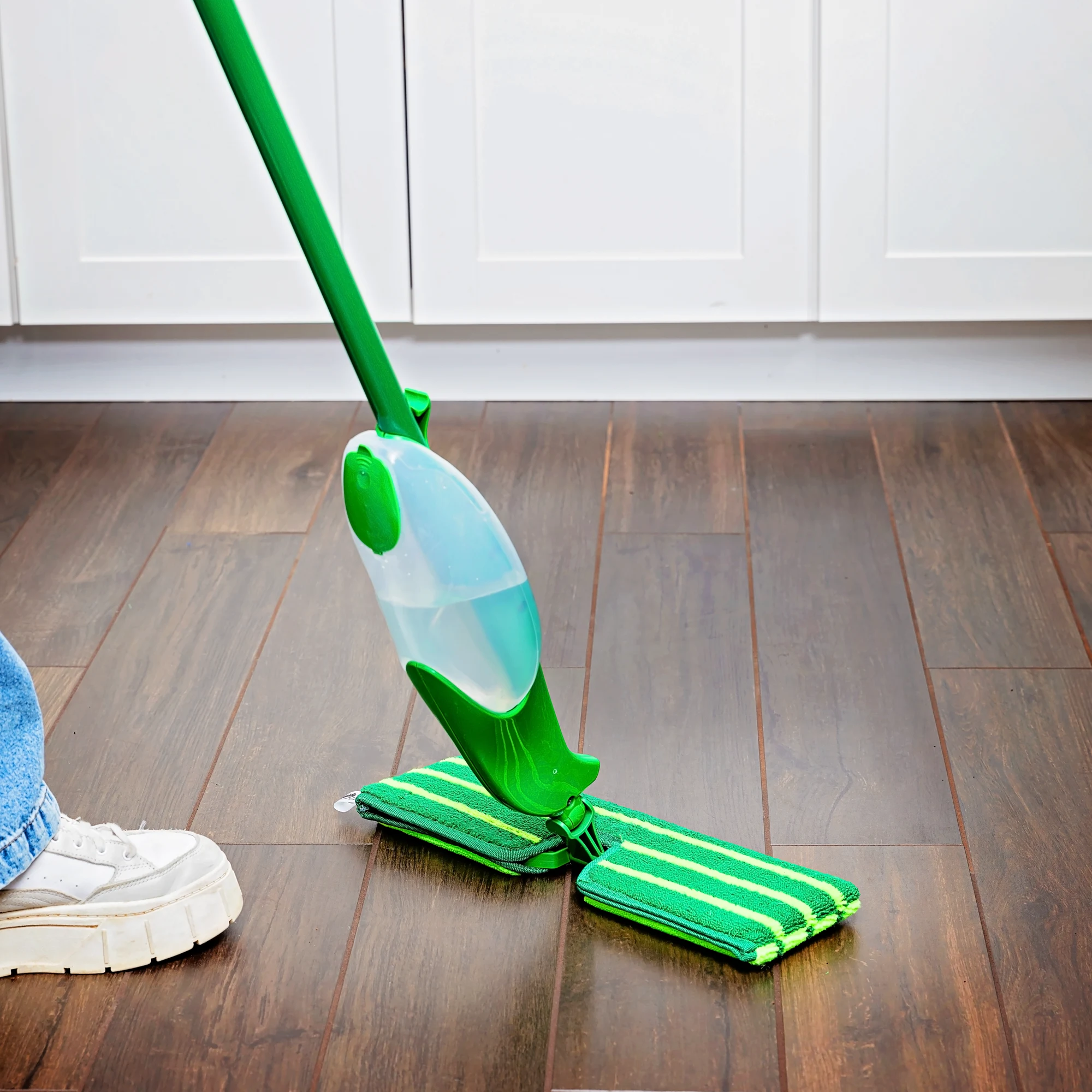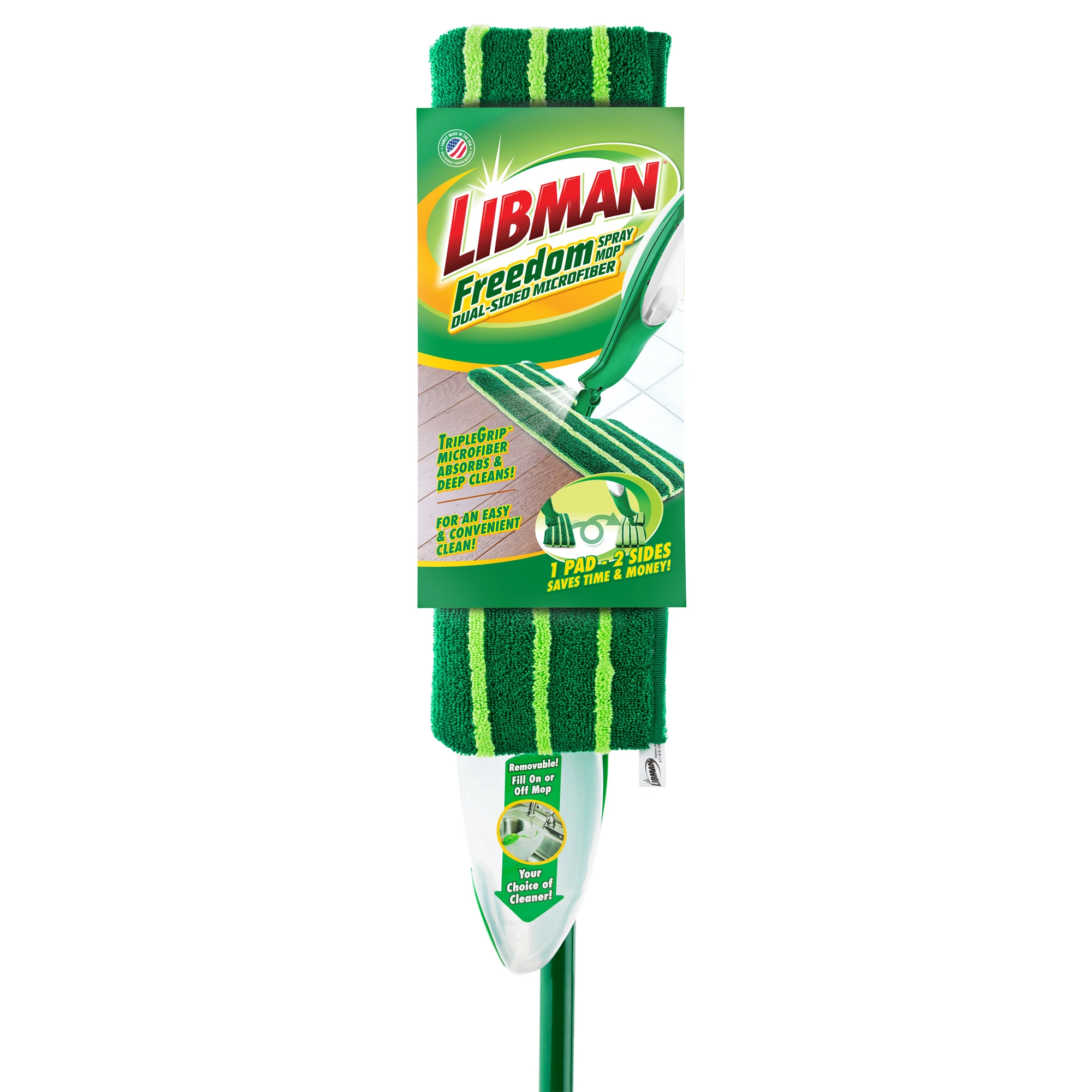 You'll flip for the convenience and cleaning power of the new and improved Freedom® Dual-Sided Microfiber Spray Mop. It allows you to free yourself from wasteful disposable cleaning pads and expensive batteries. It also gives you the freedom to use your own cleaning solution in the refillable tank. Excellent on wood, laminate, tile, marble, linoleum, stone, and more, the TripleGrip™ dual-sided microfiber pad absorbs and deep cleans your floors. You can reach into the toughest and tightest of corners with precise control, thanks to the 360° swivel neck. When you’re done cleaning, simply remove the mop head and toss it in the laundry to be cleaned up to 50 times.