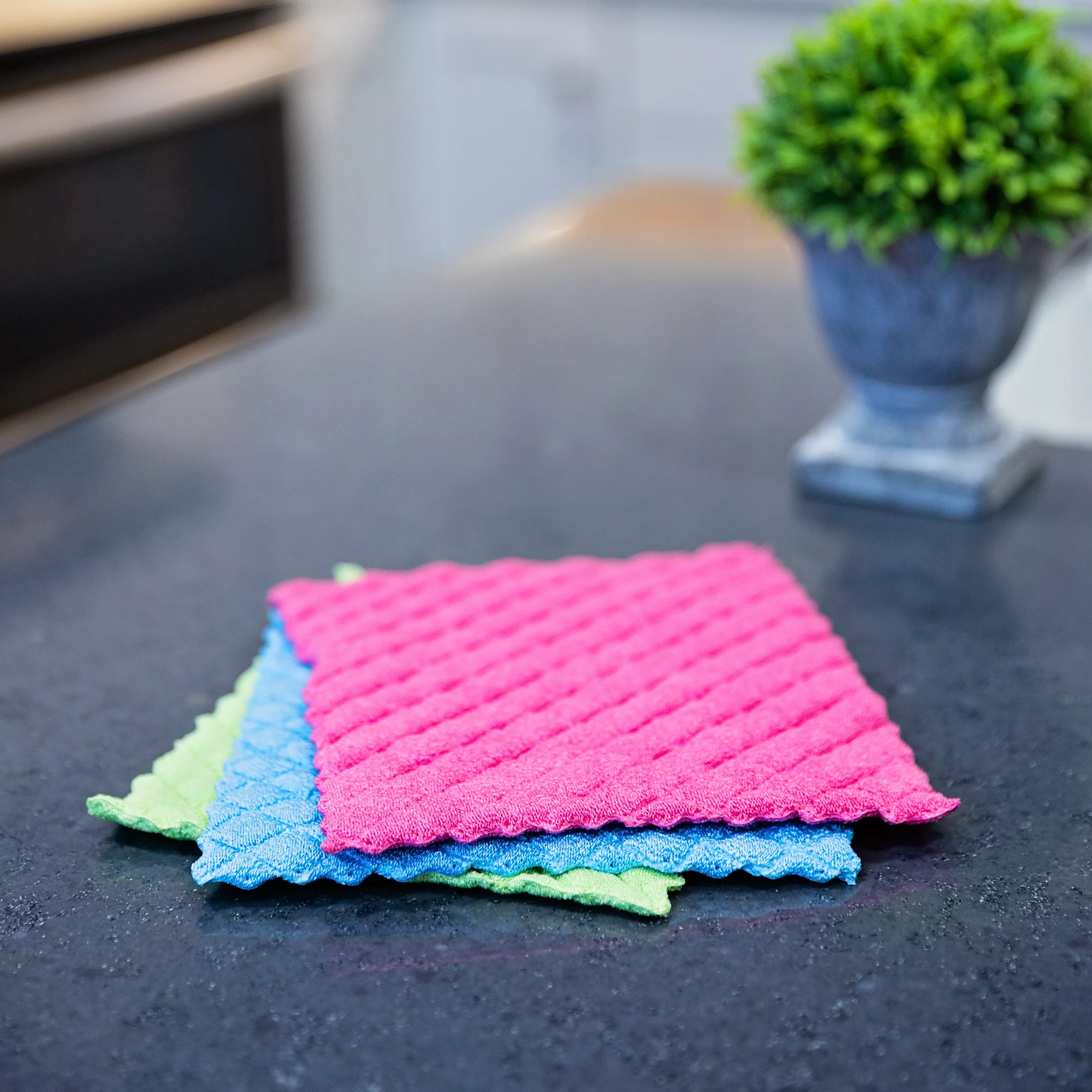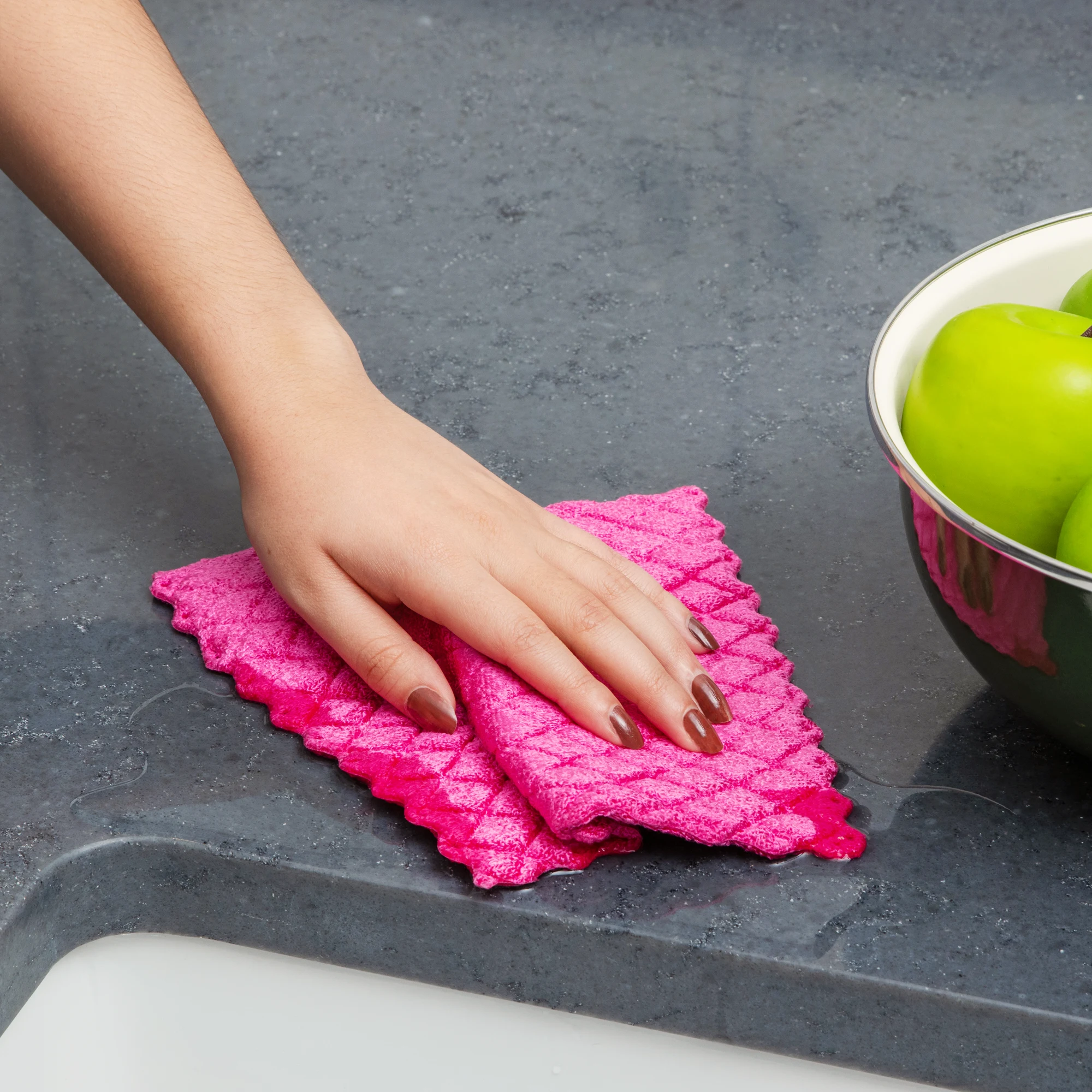 • Thin, synthetic sponge is quilted between two microfiber cloths, combining the best of a sponge and a dishcloth